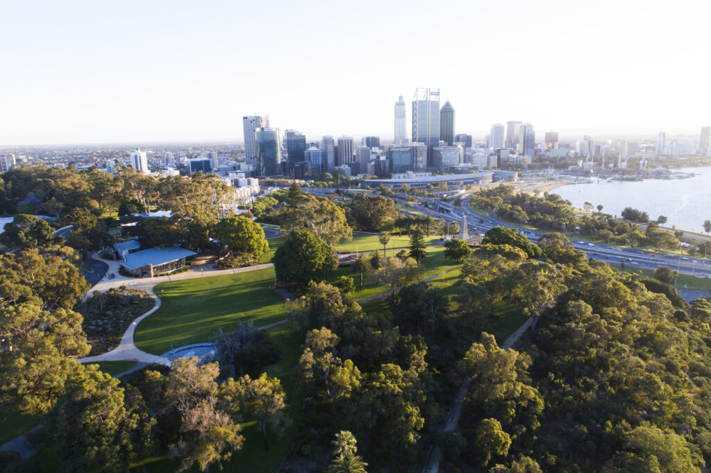 Aerial view of Kings Park and Botanical Garden with Perth City skyline in the background. Credit: Tourism WA
